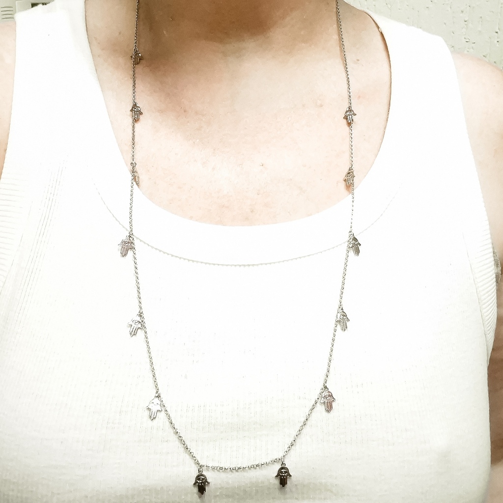 Símbolo de proteção e espiritualidade, a corrente longa com pingentes de Mão de Fátima é uma peça que une significado e estilo. Cada detalhe remete à força do amuleto, representado com delicadeza em mini pingentes distribuídos ao longo da corrente, criando movimento e leveza ao visual.